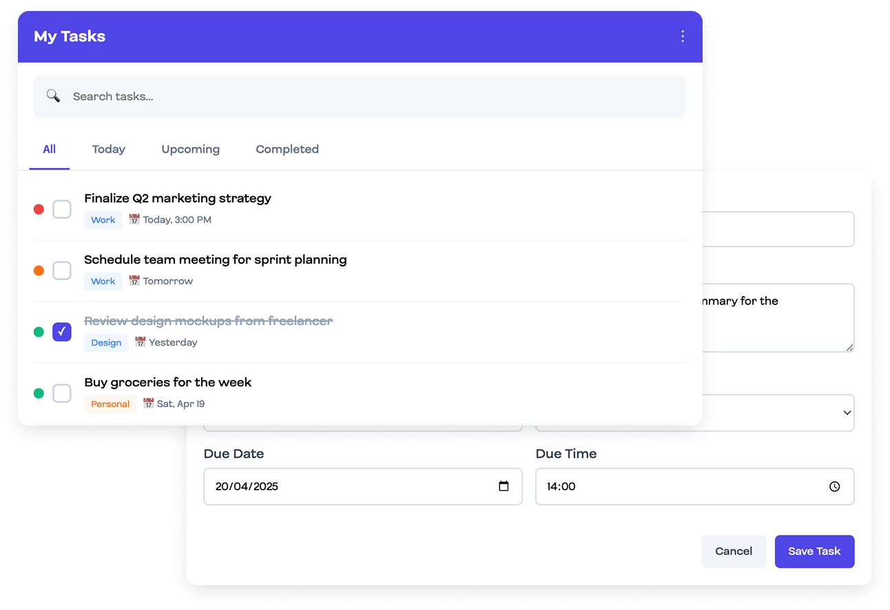 Stay organized with our intuitive task interface. Prioritize, categorize, and track all your to-dos in one place.